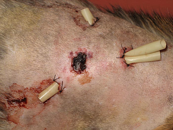 We got our cat back in the end. She is doing fine. There are two latex tubes stuck under her skin. The ends of the tubes are on the outside of the skin and the purpose is to drain the pus. It all looks weird and a bit gross too. The tubes work as prescribed. Every now and then you see a little pus mixed in with blood dripping out of the opening.